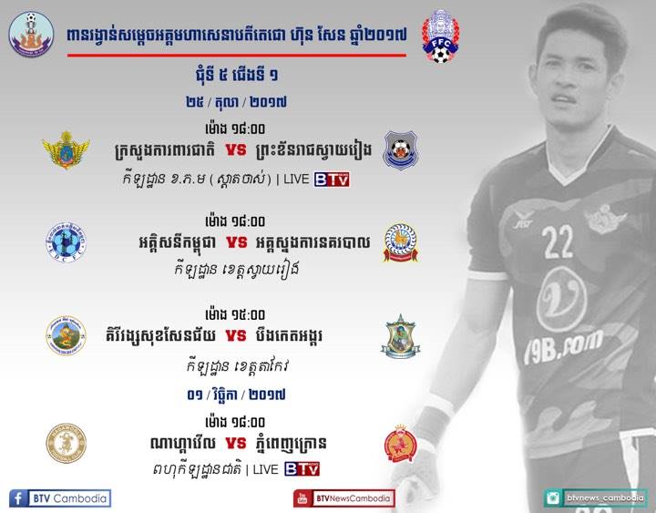 ក្រុមខ្លាំងទាំង ៨ មានក្រសួងការពារជាតិ(ទ័ព), ព្រះខ័នរាជស្វាយរៀង, ណាហ្គាវើល, ភ្នំពេញក្រោន, បឹងកេត, អគ្គិសនីកម្ពុជា, អគ្គស្នងការនគរបាលជាតិ(ប៉ូលិស), និងក្រុមគិរីវង់សុខជ័យ នឹងប្រកួតប្រជែងគ្នា ក្នុងការប្រកួតជើងទី១ ក្នុងដំណាក់កាលទី៥ ឬវគ្គ ៨ក្រុមចុងក្រោយនៃពានរង្វាន់សម្តេចហ៊ុន សែន លើកទី១១ ឆ្នាំ២០១៧ នៅលើទីលានផ្សេងគ្នា នារសៀល និងល្ងាចថ្ងៃពុធនេះ។