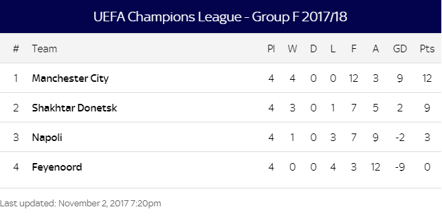 ក្រុមម្ចាស់ផ្ទះ Napoli រកគ្រាប់បាល់បញ្ចូលទីបានមុននៅនាទីទី21 ដោយខ្សែបម្រើ Insigne និងនៅនាទីទី62 ជាមួយបាល់ប៉េណាំងទីដោយកីឡាករ Frello Filho។ ប៉ុន្តែក្រុមភ្ញៀវមានឪកាសវាយ បកយកឈ្នះវិញតាមរយៈ គ្រាប់បាល់ចំនួន 4គ្រាប់គឺខ្សែការពារស្តាំសញ្ជាតិអាហ្សង់ទីន Otamendi នៅនាទីទី34 ខ្សែការពារកណ្តាល Stone នៅនាទីទី48 ហើយខ្សែប្រយុទ្ធ Aguero នៅនាទីទី69 និង Sterling នៅនាទីទី(90+2)។ ជ័យជំនះក្រៅទឹកដីនេះធ្វើអោយក្រុម Man.City មានកៅអីមួយទៅវគ្គ 16ក្រុមបន្តទៀត។ ក្រោយការប្រកួត 4ដងកន្លងមកក្រុមលេខ2 Shakhtar Donetsk មាន 9ពិន្ទុ និង ក្រុមលេខ3 Napoli មាន 3ពិន្ទុ និង ក្រុមលេខ4 Feyenoord មាន ០ពិន្ទុ។