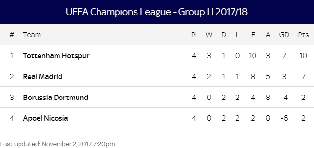 បញ្ចប់ការប្រកួតក្រុម Tottenham 3:1 Real Madrid ធ្វើអោយក្រុមដែលដឹកនាំដោយអ្នកចាត់ការលោក Mauricio Pochettino មានកៅអីមួយទៅវគ្គ16ក្រុមចុងក្រោយបន្តទៀត ដោយមាន ១០ពិន្ទុក្នុងដៃ ខណៈ Real មាន 7ពិន្ទុ និងក្រុម Dortmund រួមជាមួយ Apoel Nicosia មាន២ពិន្ទុដូចគ្នាក្រោយប្រកួតបាន 4ប្រកួត៕