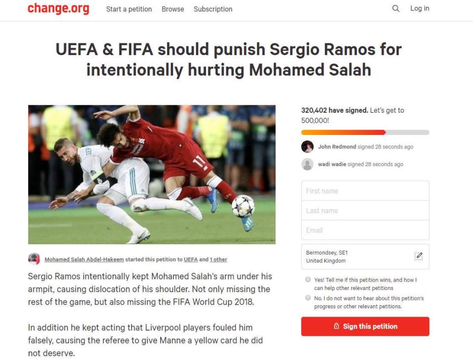 មនុស្សជាង៤៥៥,០០០នាក់បានស៊ីញេលើញត្តិតាមបណ្ដាញអ៊ីនធឺណិត អំពាវនាវឱ្យសហព័ន្ធកីឡាបាល់ទាត់ទ្វីបអឺរ៉ុប (UEFA) និងសហព័ន្ធកីឡាបាល់ទាត់អន្តរជាតិ (FIFA) ដាក់ទណ្ឌកម្មលើខ្សែការពារ Sergio Ramos ចំពោះការធ្វើឱ្យ Mohamed Salah របួសអំឡុងការប្រកួតផ្ដាច់ព្រ័ត្រ Champions League រវាង Real Madrid និង Liverpool ថ្ងៃសៅរ៍ទី២៦ខែឧសភាឆ្នាំ២០១៨។