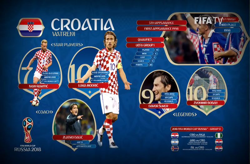 កីឡាករឆ្នើម: Luka Modric, Ivan Rakitic និង Ivan Perisic គឺជាខ្សែបម្រើឆ្នើមកំពុងលេងអោយក្លឹបធំៗនៅអឺរ៉ុប។