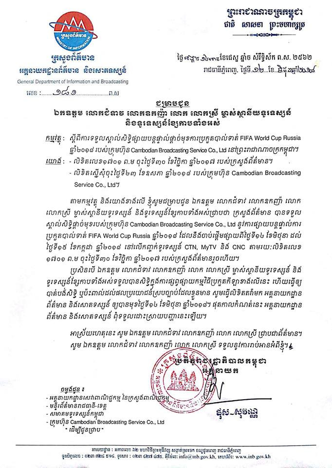 ជុំវិញការផ្សាយ World Cup 2018 ក្រសួងព័ត៌មានចេញសេចក្ដីជូនដំណឹងបន្ទាន់មួយ