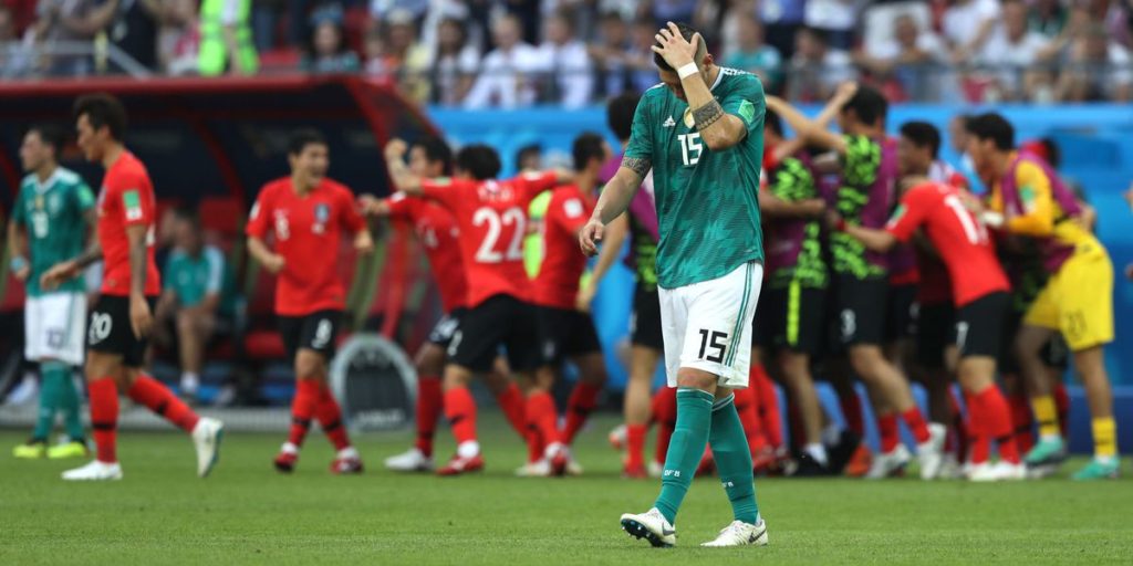 ក្រុមម្ចាស់ជើងឯក ៤សម័យកាលមួយនេះ ត្រូវតែផ្តួលក្រុមកូរ៉េខាងត្បូង ដោយគ្រាប់បាល់នាំមុខចាប់ពី២គ្រាប់ឡើងទៅ ក្នុងការប្រកួតចុងក្រោយនៃពូល F របស់ពួកគេក្នុងទីក្រុង Kazan ដើម្បីឈានទៅវគ្គ ១៦ក្រុមចុងក្រោយ។ ប៉ុន្តែ ក្រោយពីបានខ្ជះខ្ជាយឱកាសជាច្រើន ក្រុមជម្រើសជាតិអាល្លឺម៉ង់ បានស្រឡាំងកាំងនៅនាទីបន្ថែម៥នាទី ខណៈដែលកូរ៉េខាងត្បូង បានស៊ុតបាល់បញ្ចូលទី ២គ្រាប់ ដើម្បីកត់ត្រាជ័យជម្នះជាប្រវត្តិសាស្ត្រមួយ លើក្រុមមានចំណាត់ថ្នាក់លេខ១ក្នុងពិភពលោកមួយនេះ និងធ្វើឲ្យអាល្លឺម៉ង់ ធ្លាក់ទៅឈរនៅបាតតារាងនៃពូល។