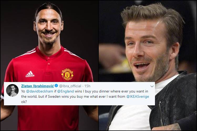 ការផុសបែបនេះដោយមុនការប្រកួតរវាងអង់គ្លេសនិងស៊ុយអែតវគ្គ៨ក្រុមចុងក្រោយយប់មិញ Zlatan បានភ្នាល់ជាមួយ Beckham ថាប្រសិនបើអង់គ្លេសឈ្នះលោកសុខចិត្តប៉ាវអាហារពេលល្ងាចឲ្យ Beckham កន្លែងណាក៏បាននៅជុំវិញពិភពលោក ឲ្យតែអតីតប្រធានក្រុមជម្រើសជាតិអង់គ្លេសពេញចិត្ត។ ប៉ុន្តែប្រសិនបើ ស៊ុយអែតឈ្នះវិញ អតីតសមាជិក LA Galaxy ត្រូវទិញផលិតផលម៉ាក IKEA ឲ្យខ្លួនវិញ។