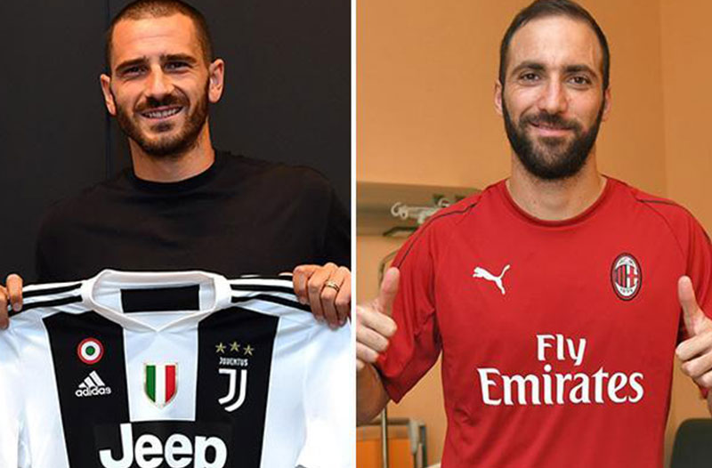 AC Milan បានចុះហត្ថលេខាជាមួយនឹង Higuain វ័យ ៣០ឆ្នាំ ក្នុងកិច្ចសន្យាខ្ចីជើងរយៈពេល ១ឆ្នាំ ដែលមានតម្លៃជាទឹកប្រាក់ ១៨លានអឺរ៉ូ (ស្មើនឹង២១លានអឺរ៉ូ) ជាមួយនឹងជម្រើសទិញយកខ្សែប្រយុទ្ធរូបនេះ នៅរដូវក្តៅក្រោយ សម្រាប់តម្លៃខ្លួន ៣៦លានអឺរ៉ូប បន្ថែមទៀត។ ខ្សែការពារកណ្តាលអន្តរជាតិអ៊ីតាលី Bonucci ត្រូវបានដោះដូរជាមួយនឹងកីឡាករ Mattia Caldara ត្រឹមតែប៉ុន្មានសប្តាហ៍ ក្រោយពីកីឡាករ Caldara បានចូលរួមជាមួយនឹងក្លិប Juventus ក្រោយពីការផ្ទេររបស់គេពីក្លិប Atalanta ខណៈដែលការផ្ទេរនេះ ត្រូវបានព្រមព្រៀងគ្នាតាំងពីខែមករា ឆ្នាំ២០១៧ មកម្ល៉េះ។