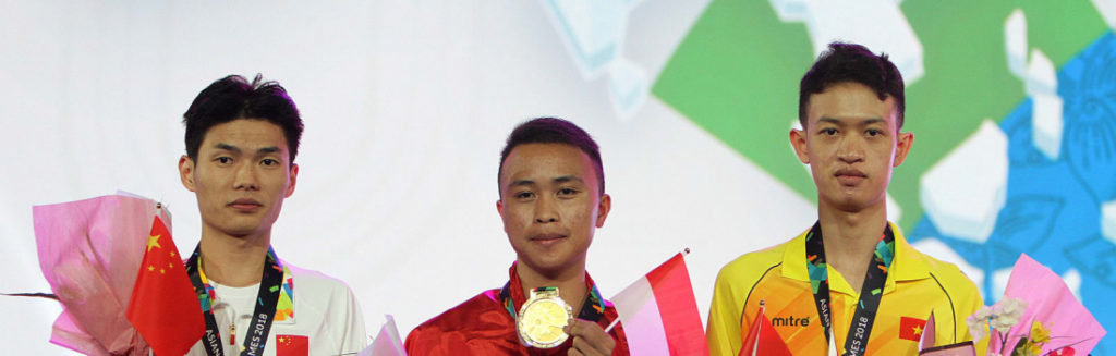 កីឡាករវៀត (ឆ្វេង) ឥណ្ឌូណេស៊ី (កណ្តាល) និងចិន (ឆ្តាំ) រូបថត៖ Asian Games
