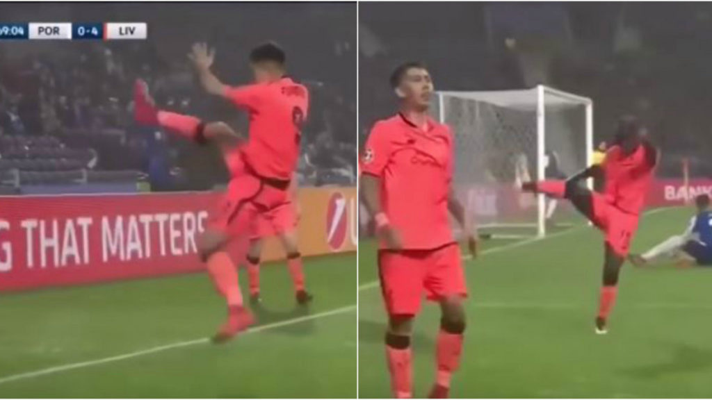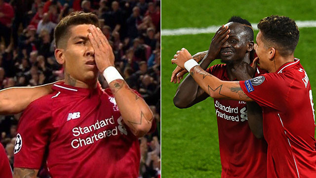 ខ្សែ​ស្លាប Sadio Mane ត្រូវ​បាន​សង្កេត​​ឃើញ​ថា ចូល​ចិត្ត​ធ្វើ​ត្រាប់​ការ​អបអរ​ក្រោយ​ការ​ស៊ុត​បញ្ចូល​ទី តាម​មិត្ត​រួម​ក្រុម Roberto Firmino។