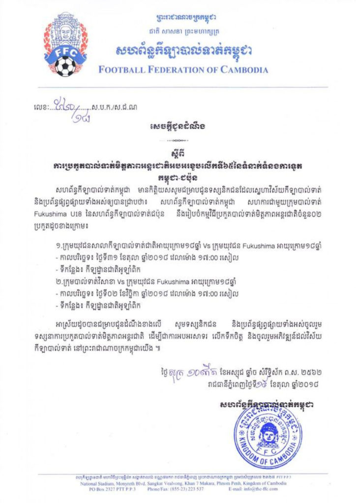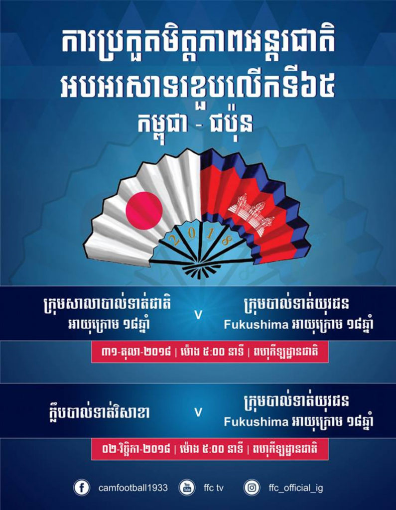 សហព័ន្ធកីឡាបាល់ទាត់កម្ពុជា នឹងរៀបចំការប្រកួតមិត្តភាពអបអរខួបលើកទី៦៥ ឆ្នាំនៃទំនាក់ទំនងការទូត កម្ពុជា-ជប៉ុន ដោយក្រុម U-18 កម្ពុជា ប៉ះក្រុម U-18 Fukushima របស់ជប៉ុននាថ្ងៃទី៣១ ខែតុលា ឆ្នាំ២០១៨ នៅពហុកីឡដ្ឋានជាតិវេលាម៉ោង ៥:០០ ល្ងាច ដែលការទស្សនាគឺបើកសេរី ពោលគឺគ្មានការលក់សំបុត្រឡើយ។
