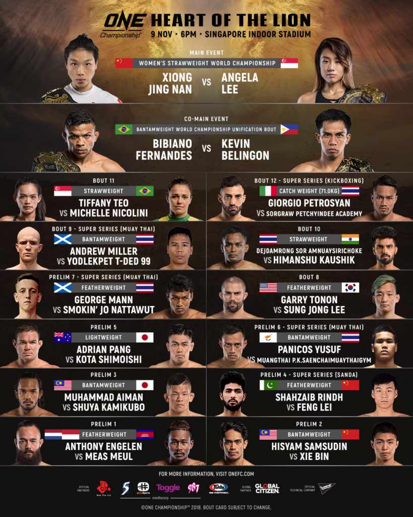ថ្ងៃសុក្រ ទី០៩ ខែវិច្ឆិកានេះ ដែលត្រូវចំនឹងថ្ងៃទិវាឯករាជ្យជាតិ កម្ពុជានឹងមានវត្តមានលើសង្វៀនក្បាច់គុនពិភពលោក ដែលប្រព្រឹត្តិទៅនៅឯកីឡដ្ឋានសិង្ហបុរីក្នុងព្រឹត្តិការណ៍ ONE: HEART OF THE LION ។ ជើងខ្លាំងកំពូលៗមកពីទូទាំងពិភពលោកចំនួន ១៤គូរ នឹងបញ្ចេញសមត្ថភាពតំណាងឱ្យប្រទេសរបស់គេរៀងៗខ្លួនដើម្បីដណ្តើមយកខ្សែក្រវាត់ Bantamweight World Unification Championship។