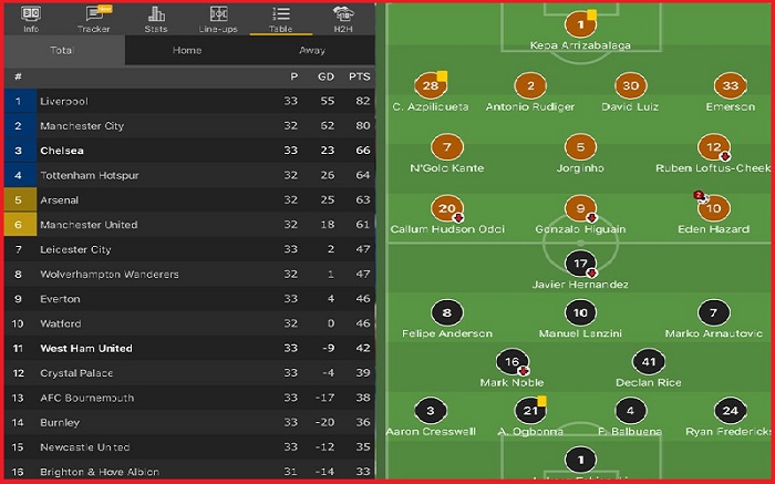 ក្រុមម្ចាស់ផ្ទះ Chelsea ដែលឈរលេខរាងទី៣មក្រោម Manchester City ១លេខនៅតែអាចមានឱកាសលេង UEFA Champions League នៅរដូវកាលក្រោយ បើសិនពួកគេឈ្នះពាន UEFA Europa League មាន៣ពិន្ទុពីលើក្រុមលេខ៥ Arsenal ដែលនៅសល់១ប្រកួតក្នុងដៃ នឹងក្រុមកំពូលតារាងហង្សក្រហម Liverpool បន្ទាប់ពីពួកគេឈ្នះ ៣ប្រកួតជាប់ៗគ្នាក្នុងលីគ៕