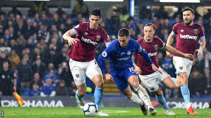 តារាឆ្នើម Eden Hazard ដែលត្រៀមខ្លួននឹងចាកចេញពិក្លឹបរបស់ខ្លួនឆាប់ៗនេះបានស៊ុតបញ្ចូលទី២គ្រាប់ម្នាក់ឯង ជួយឲ្យក្រុមតោខៀវ Chelsea យលឈ្នះលើញញួរធំ West Ham ២ទល់០ ធ្វើឲ្យក្រុមតោខៀវ វ៉ា Tottenham Hotspur និងកាំភ្លេងធំ Arsenal ឡើងទៅឈរលេខ៣ ក្នុងតារាងក្របខណ្ឌ័ Premier League​ នៅក្នុងទឹកដី​ Stamford Bridge កាលពីយប់មុិញនេះ។