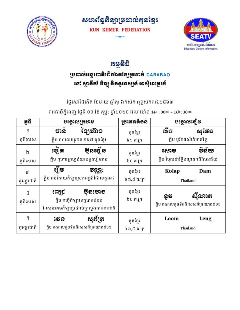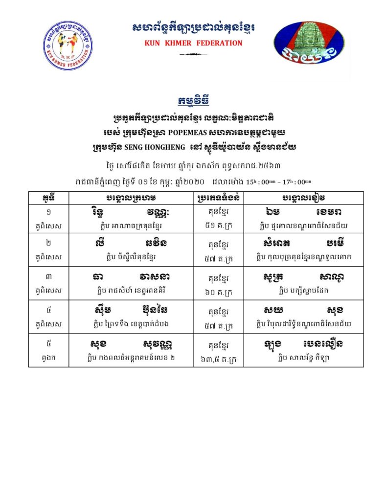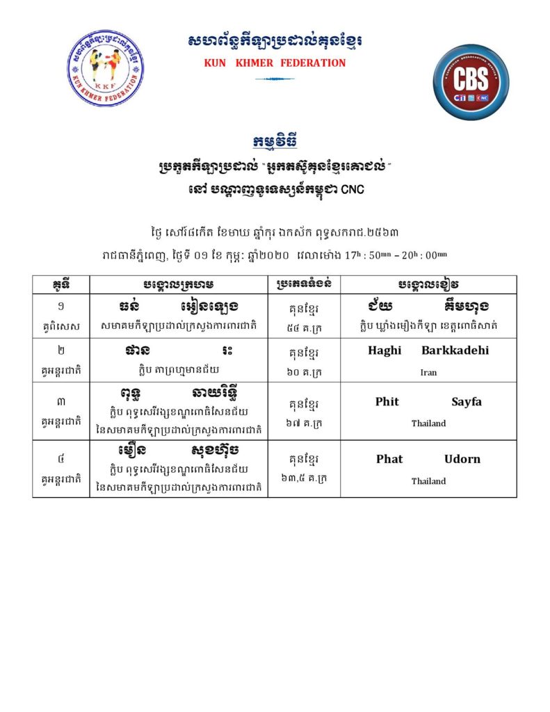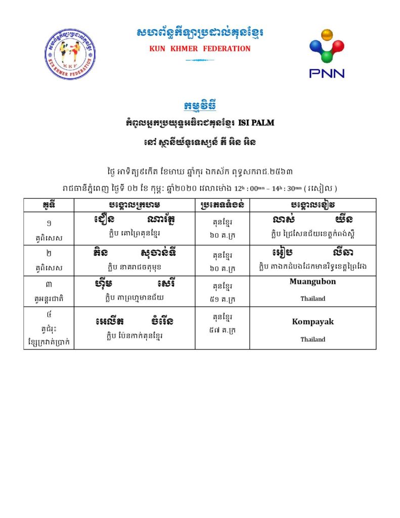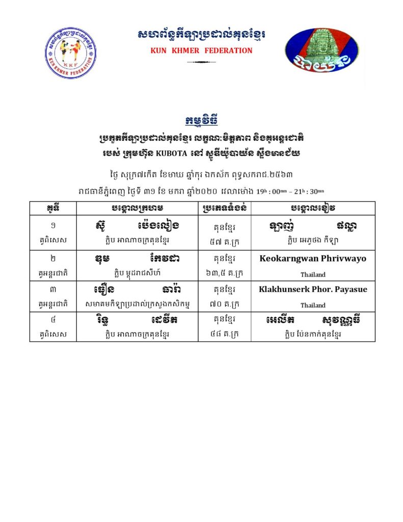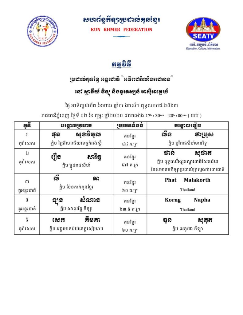 សម្រាប់អ្នកដែលគាំទ្រវិស័យកីឡាប្រដាល់កម្ពុជា ខាងក្រោមនេះគឺជាតារាងពេលវេលា ប្រកួតប្រដាល់ក្បាច់គុនបុរាណខ្មែរគ្រប់ស្ថាប័ន សម្រាប់ថ្ងៃសុក្រ, ថ្ងៃសៅរ៍, និងថ្ងៃអាទិត្យ ដែលត្រូវនិង ថ្ងៃទី៣១ ខែមករា – ថ្ងៃទី០២ ខែកុម្ភៈ ឆ្នាំ២០២០ ក្នុងចុងសប្ដាហ៍នេះ។