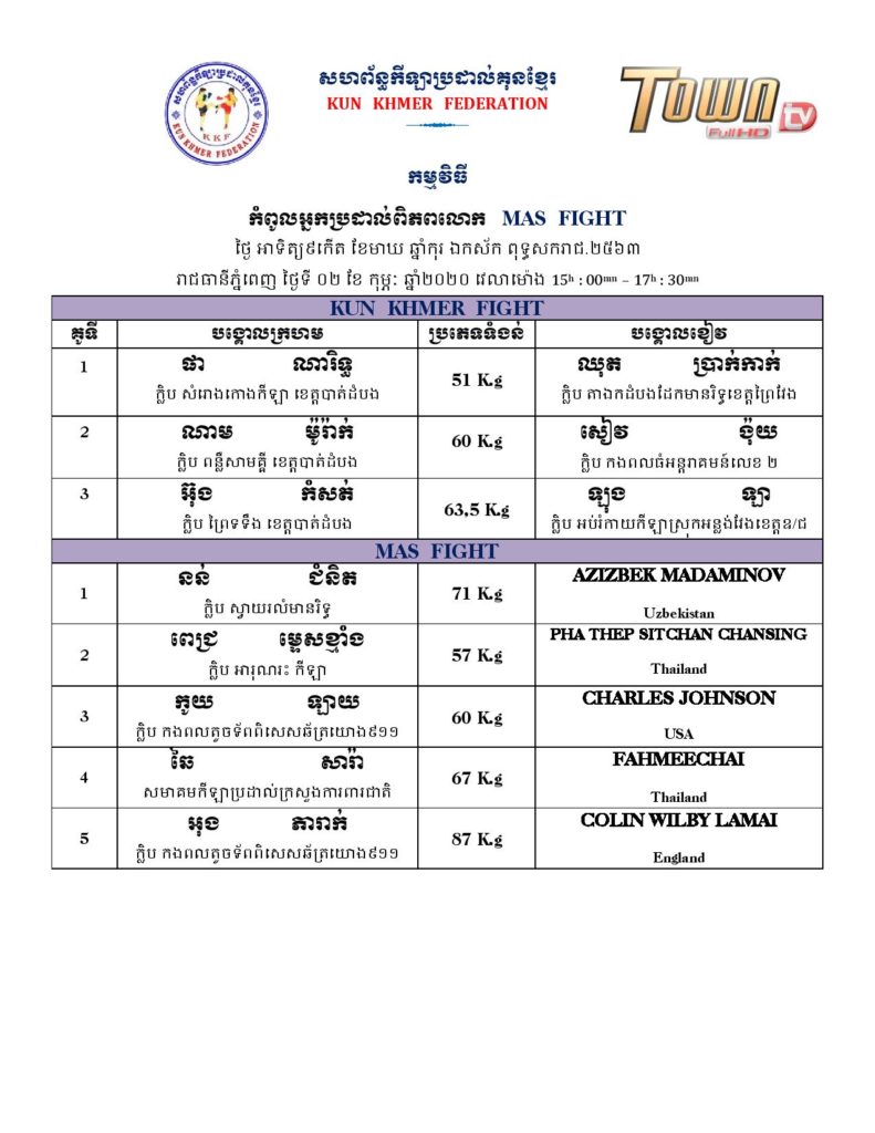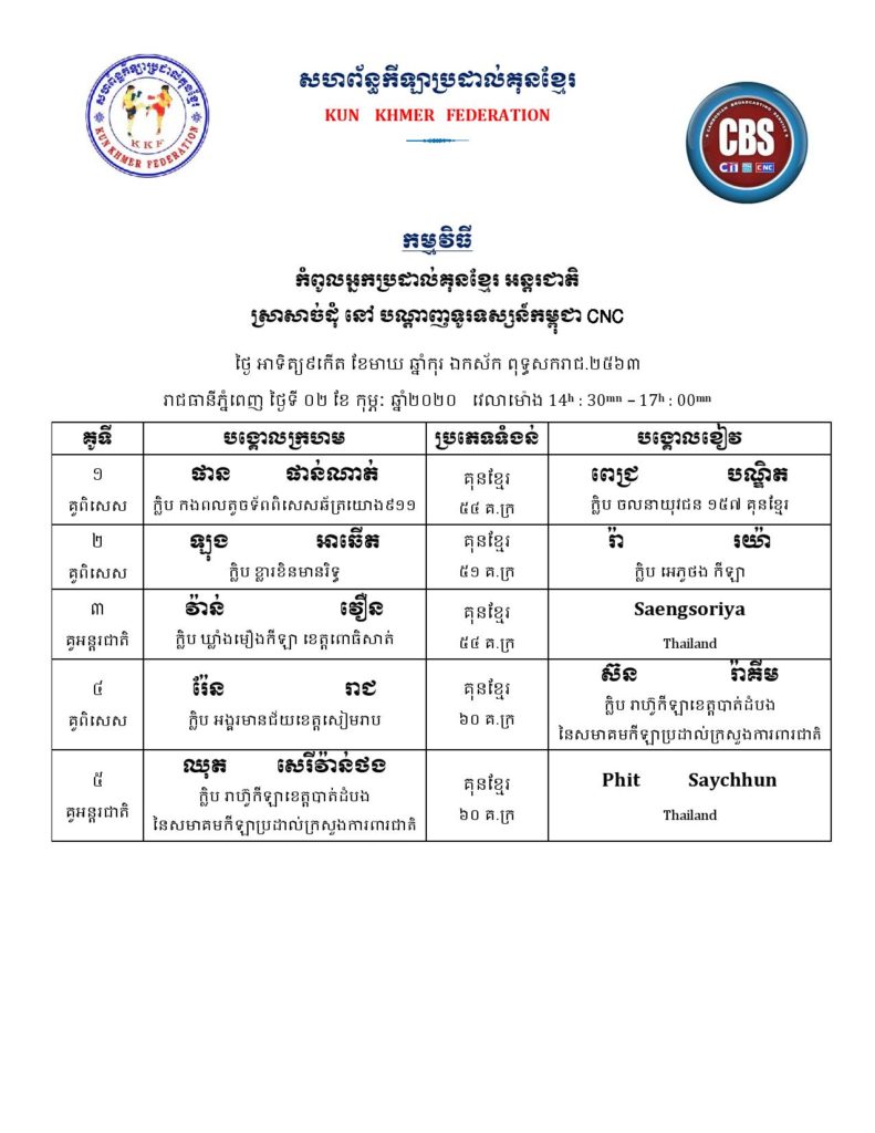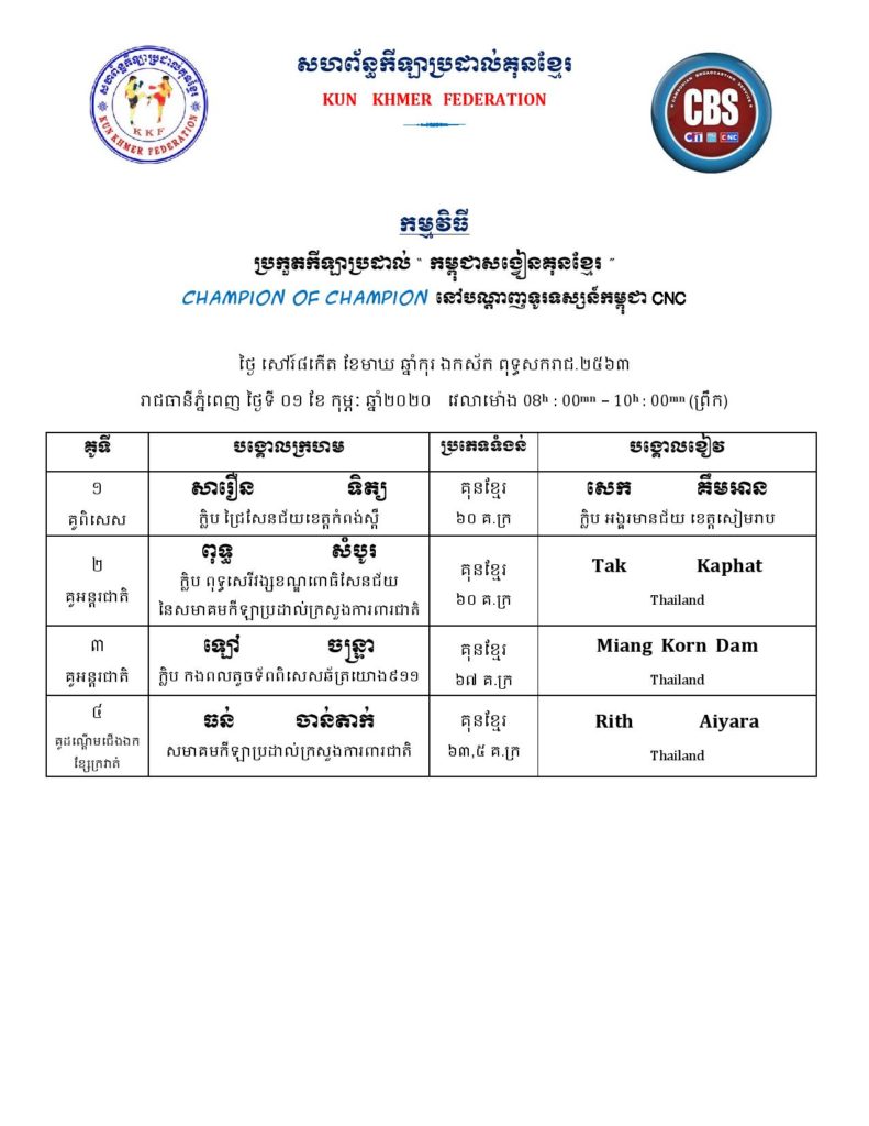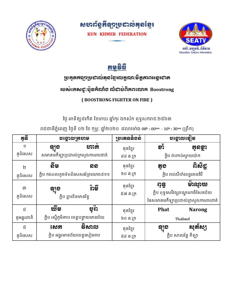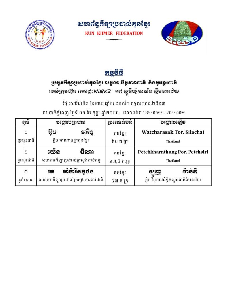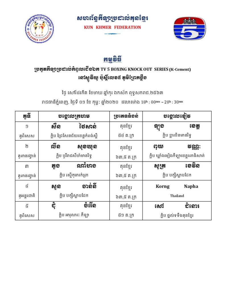 សម្រាប់អ្នកដែលគាំទ្រវិស័យកីឡាប្រដាល់កម្ពុជា ខាងក្រោមនេះគឺជាតារាងពេលវេលា ប្រកួតប្រដាល់ក្បាច់គុនបុរាណខ្មែរគ្រប់ស្ថាប័ន សម្រាប់ថ្ងៃសុក្រ, ថ្ងៃសៅរ៍, និងថ្ងៃអាទិត្យ ដែលត្រូវនិង ថ្ងៃទី៣១ ខែមករា – ថ្ងៃទី០២ ខែកុម្ភៈ ឆ្នាំ២០២០ ក្នុងចុងសប្ដាហ៍នេះ។