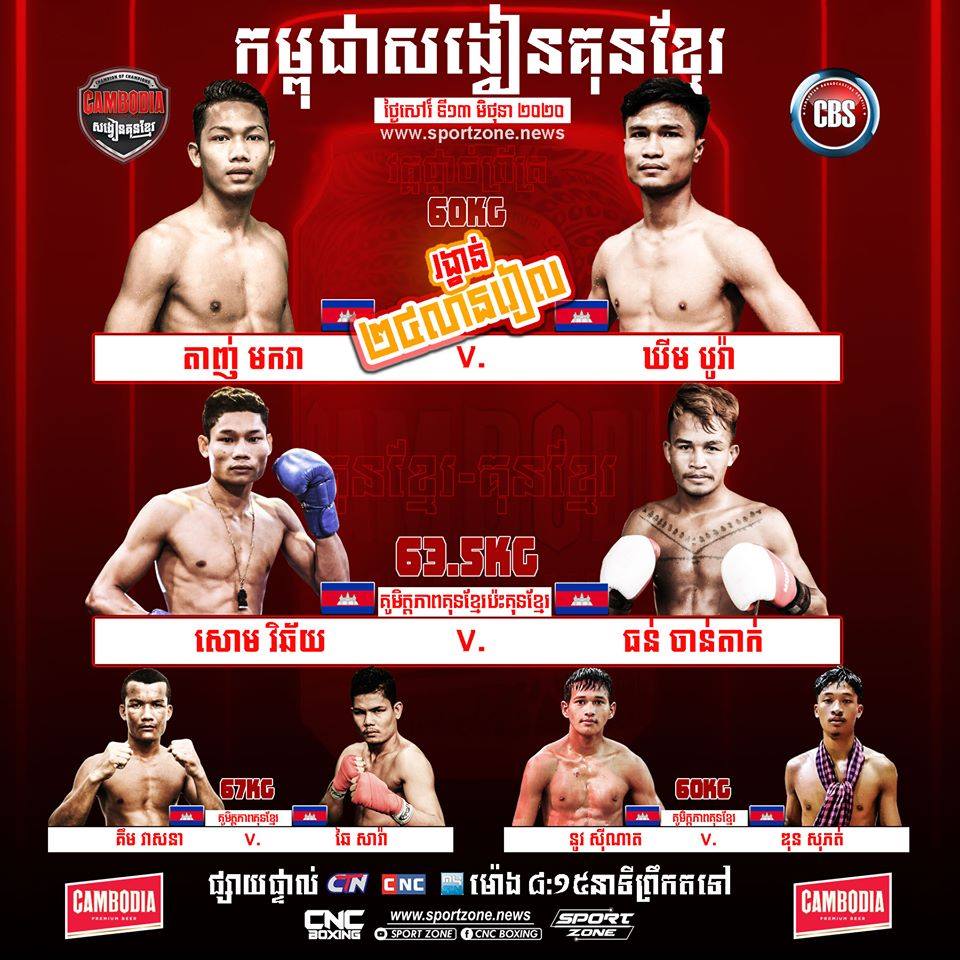 អ្នកប្រដាល់មកពីជាយដែនខេត្តបន្ទាយមានជ័យ ឃីម បូរ៉ា និង តាញ់ មករា ដែលសុទ្ធតែដិតដាមទៅដោយការខកចិត្ត ចំពោះការបាត់ឱកាសឈ្នះខ្សែក្រវាត់ជាបន្តបន្ទាប់ នៅក្នុងអាជីពនោះ បានបង្ហាញការស្រេកឃ្លាន ក្នុងការប្រជែងគ្នាយកខ្សែក្រវាត់ ជាលើកដំបូង ខណៈអ្នកទាំង២ ត្រូវប្រកួតផ្តាច់ព្រ័ត្រដណ្តើមខ្សែក្រវាត់ និងប្រាក់រង្វាន់៦០០០ដុល្លារ ក្នុងព្រឹត្តិការណ៍ «កម្ពុជាសង្វៀនគុនខ្មែរ» នៅលើសង្វៀន CNC ព្រឹកថ្ងៃសៅរ៍នេះ។